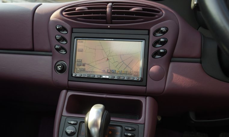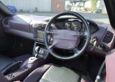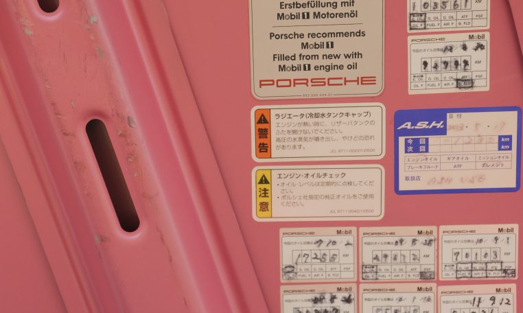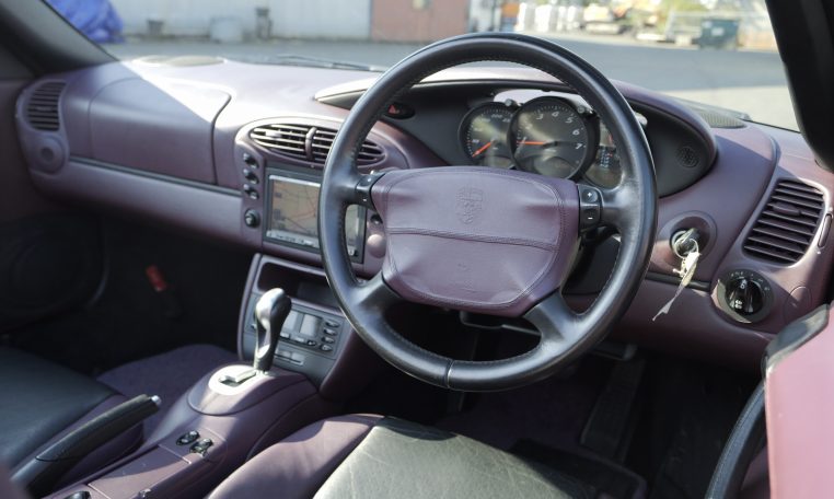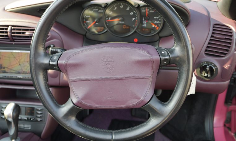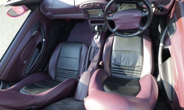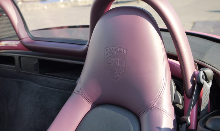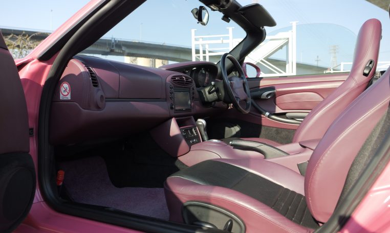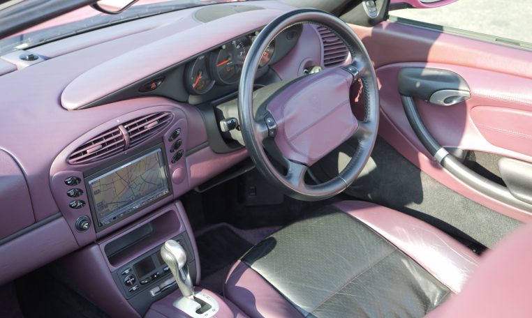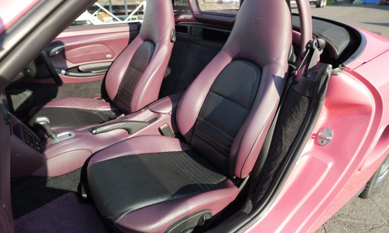 Japan market example finished in Paint to sample 8C2 Porsche Pink Pearl with special full leather interior in magenta and black leather with Porsche-crests in the seat headrest.